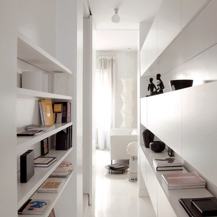 In presenza di corridoi abbastanza capienti si può sfruttare lo spazio inserendo scaffali o ripiani per contenere riviste e oggettistica, oppure anche dei moduli chiusi tra un ripiano e l’altro dove riporre cose più riservate o semplicemente quelle cose che ‘so che mi serviranno ma chissà quando mi serviranno, intanto le pongo qua’.