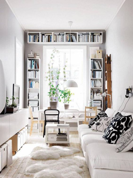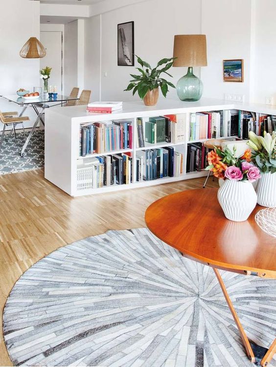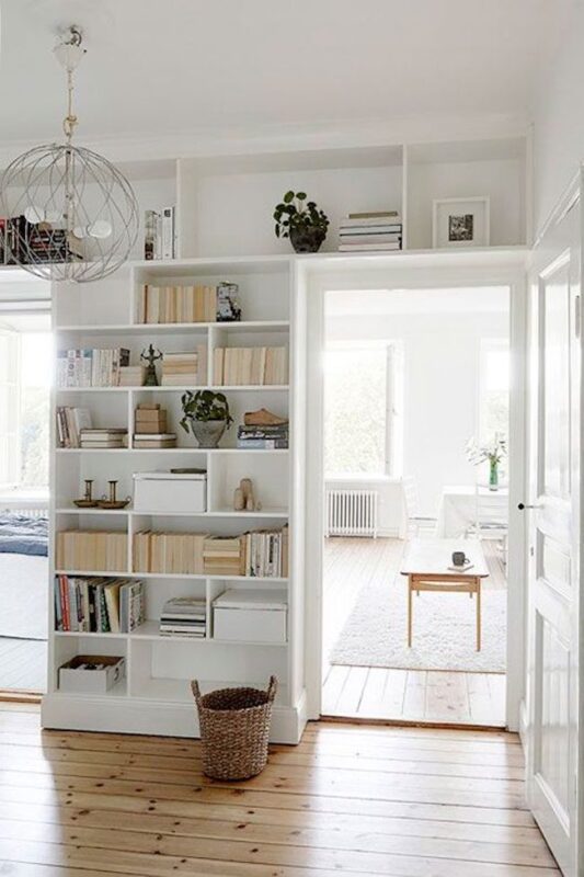 Un’altra regola è quella di utilizzare, negli spazi molto piccoli o poco luminosi, gli scaffali al posto delle librerie: oltre ad essere più leggeri come impatto visivo, potete posizionarli come meglio credete.