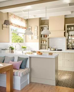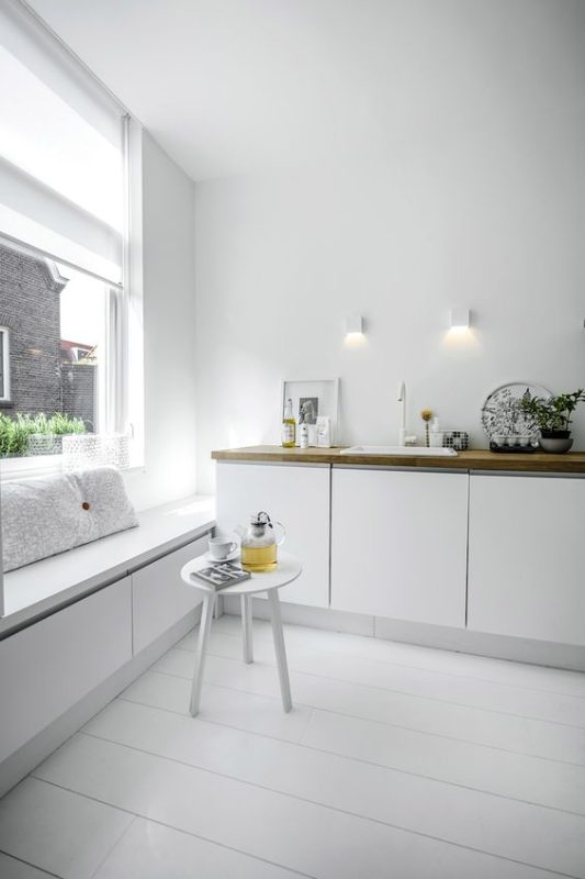 Lo spazio al di sotto di una finestra bassa è difficile da sfruttare, soprattutto in cucina. Qui gli arredi standard hanno un’altezza che si aggira intorno agli 80-90cm, cosa fare se la finestra arriva più in basso? Un valido compromesso è collocarvi una cassapanca, che possa essere un utile contenitore e anche una seduta graziosa per il tavolo da colazione, come in questa immagine.